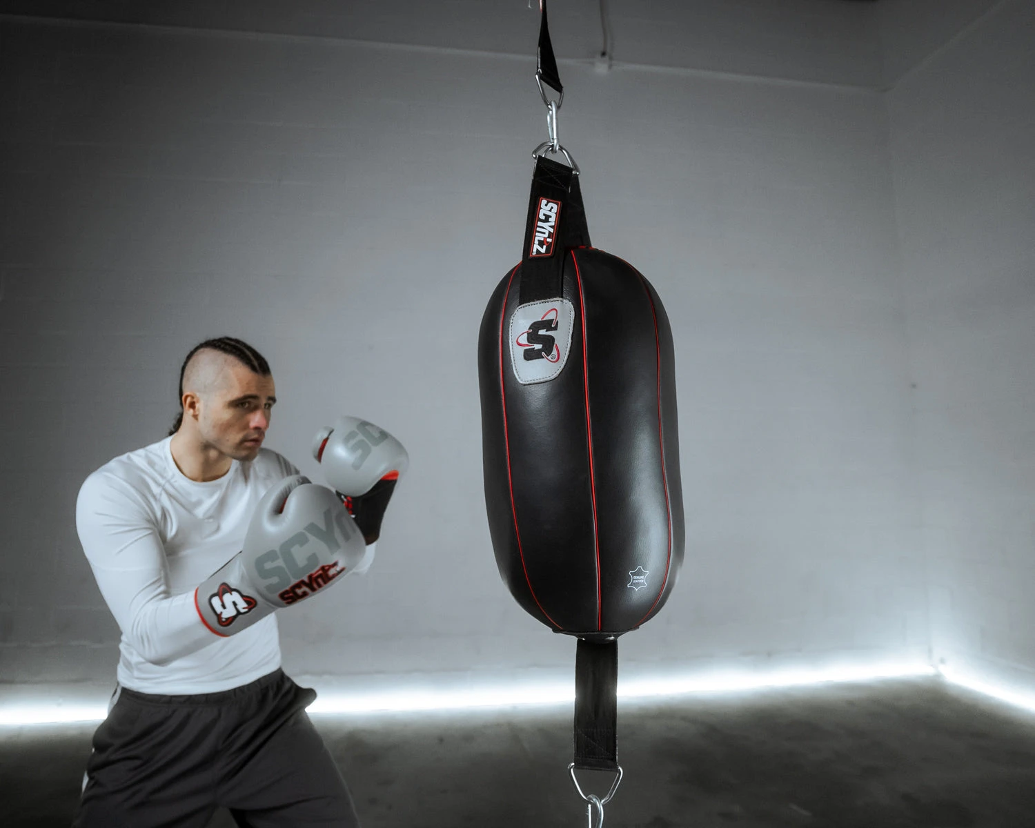 Put your training in motion with the SCYntz Leather Double End Heavy Bag. This innovative hybrid combines the unpredictable movement of a double-end bag with the impact density of a traditional heavy bag, all sculpted into a realistic body-shape design for superior target practice.