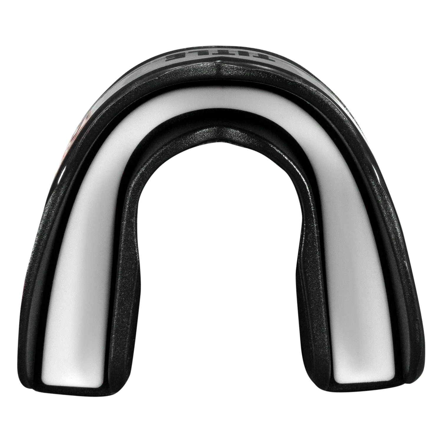 The reinspired and advanced Max Channel Mouthguard with exclusive Gel Enforced Lining® throughout the entire impact zone custom molds to teeth for an incredibly resistant, comfortable and secure fit during combat action. Improved to include increased compression rate, concussion and jaw joint protection.  Newly reinforced outer frame offers increased TMJ coverage with compression fit system to deliver additional core protection where needed most. Complete face tri-color panel stays bright and brilliant during the life of the mouth guard. Includes a vented antimicrobial custom carry case.  Bring your Pride to the Ring!